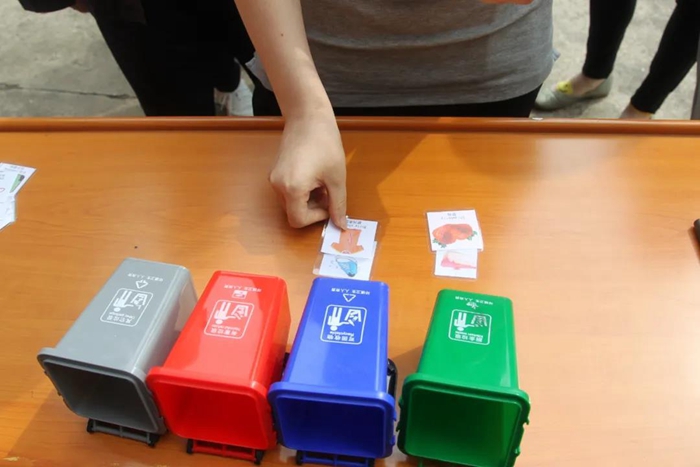 隨機(jī)抽取10張寫有各種垃圾物的卡片,在30秒內(nèi)完成判斷、分類,并準(zhǔn)確投入對應(yīng)的微型垃圾桶內(nèi)……