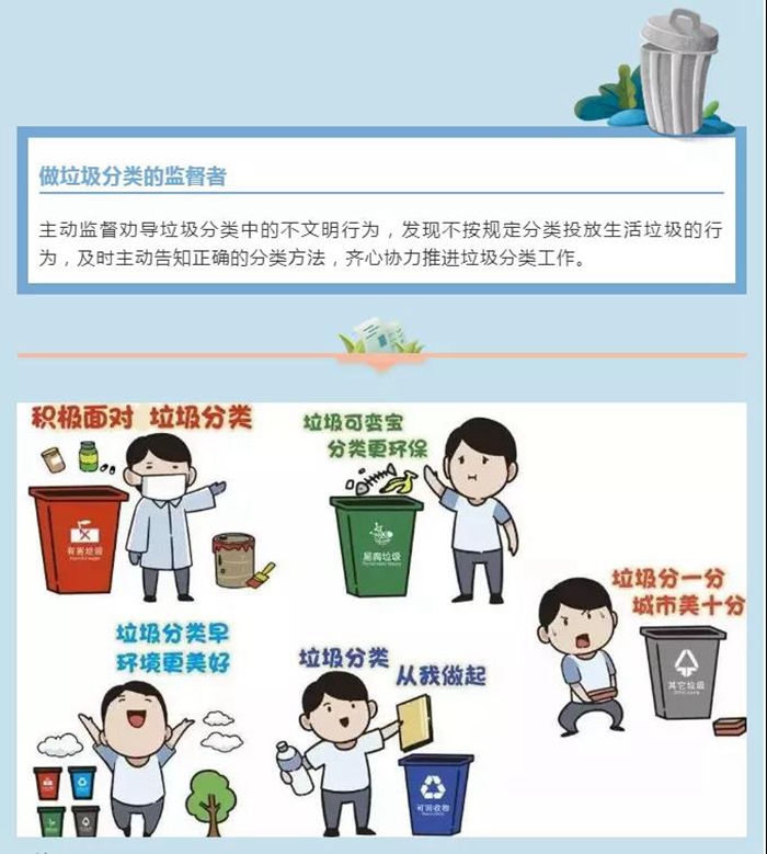 主動監(jiān)督勸導(dǎo)垃圾分類中的不文明行為,發(fā)現(xiàn)不按規(guī)定分類投放生活垃圾的行為,及時主動告知正確的分類方法,齊心協(xié)力推進(jìn)垃圾分類工作。