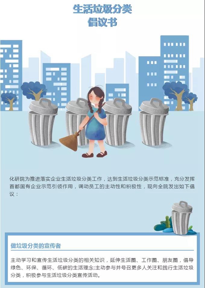 化研院為充分發(fā)揮首都國有企業(yè)在“推進(jìn)落實(shí)企業(yè)生活垃圾分類工作,達(dá)到生活垃圾分類示范標(biāo)準(zhǔn)”工作中示范引領(lǐng)作用,向全院干部職工發(fā)出了做好垃圾分類的倡議書。