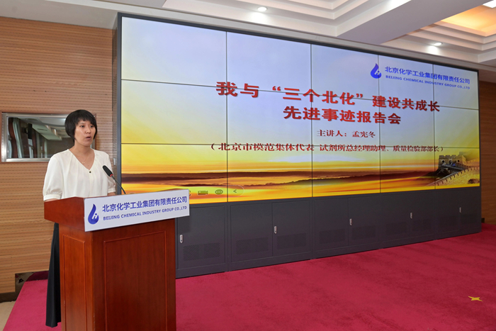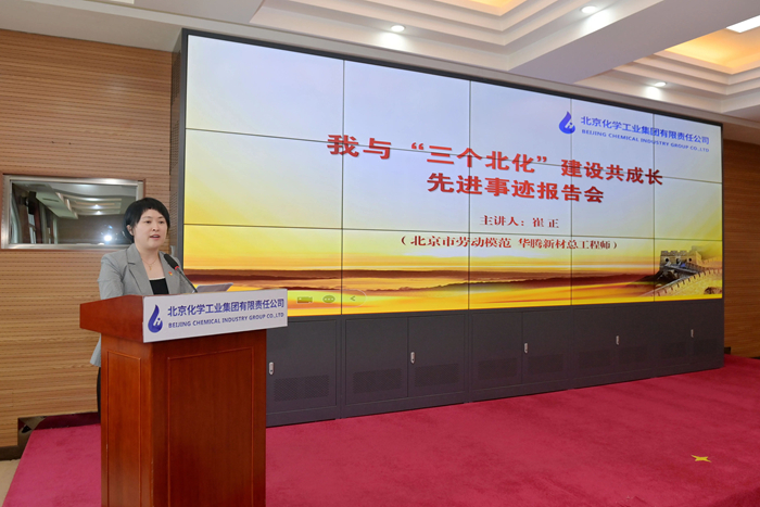 在先進事跡報告環節,市勞動模范,華騰新材總工程師崔正攜《以使命為船,以熱愛為帆,在時代洪流中奮勇爭先》;市模范集體代表,試劑所總經理助理、質量檢驗部部長孟憲冬以《傳承工匠精神,助力“三個北化”,試劑所質量檢驗部的奮進之路》為題,圍繞個人成長、科研開發、團隊建設,自信講述與北京化工共同成長的點點滴滴。