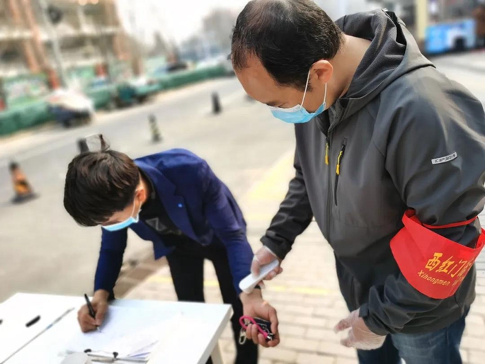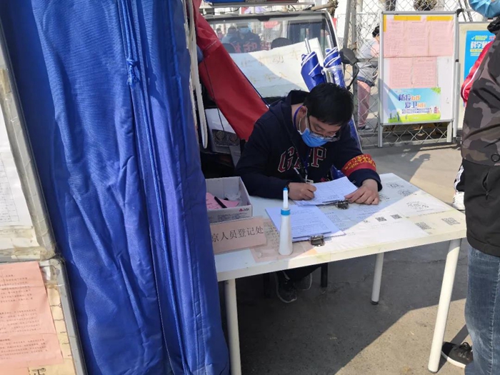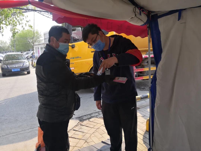 還有一件事我很驕傲。在工作中,我發(fā)現(xiàn)工作人員檢查證件時(shí)全都集中在卡口前,再加上村口人員嘈雜,使檢查工作既降低了效率,又容易造成人員聚集,于是我提議,檢查證件和測(cè)量體溫這兩項(xiàng)工作分別由兩位同事進(jìn)行,在卡口處檢查證件,進(jìn)入帳篷后由另一位同事對(duì)村民們進(jìn)行體溫測(cè)量,這樣做提高了人員通過效率,也避免了村口人員聚集。