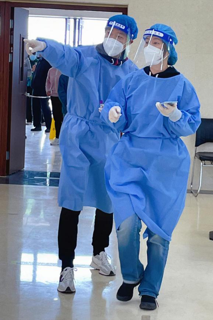 我所下沉的社區(qū)居民將近2600人,一般情況下排隊20到30米,人多的時候隊伍能有100多米長。社區(qū)分為兩道核酸通道,一天一條通道能掃描1200至1300人左右。由于戴著防護(hù)面罩與口罩,說話聲音并不是很清晰,為此我只能不停地重復(fù)著相同的提示,一天下來不僅嗓子沙啞了,汗水也浸透了全身。