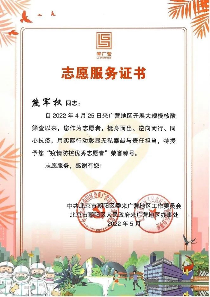 我真心地感謝北京化工集團(tuán)、華騰東光公司領(lǐng)導(dǎo)給予了我這樣一次難得的、意義深遠(yuǎn)的志愿服務(wù)機(jī)會(huì),公司黨總支、工會(huì)還給我送來(lái)了慰問(wèn)和溫暖。如果再有這樣的機(jī)會(huì),我依然會(huì)積極去服務(wù),盡自己的努力為身邊的人做一些力所能及的事。我志愿,我快樂(lè),請(qǐng)組織放心,請(qǐng)領(lǐng)導(dǎo)放心,為了北京的平安,為了社區(qū)的平安,作為國(guó)企職工,我一定堅(jiān)持到底,戰(zhàn)斗到底,直到北京全面清零,共創(chuàng)我們的美好家園。