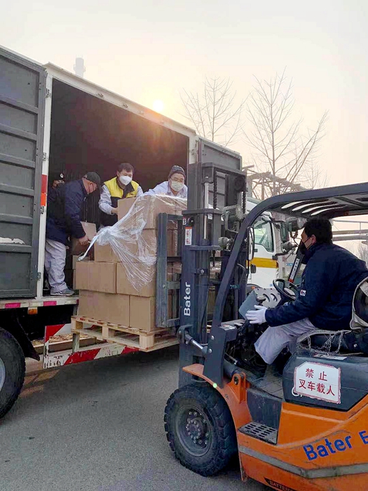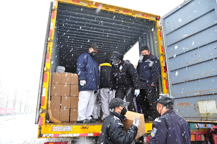 2月14日,全市普降大雪,當天又新運到5000箱500ml裝消毒酒精,華騰化工的職工們人抱肩扛、冒雪完成了卸車任務。
