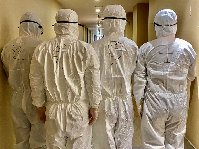 這樣的默默堅守,在我們一線服務(wù)人員身上更得到充分彰顯。在紅區(qū)工作的13名服務(wù)人員,每天要穿著厚厚的防護(hù)服為集中觀察人員送餐、送物品、搞清潔衛(wèi)生。每天,他們要全副武裝穿上防護(hù)服,并嚴(yán)格按照要求進(jìn)行消殺。要一個房間一個房間地配送餐食,送餐完畢,還要一個房間一個房間地收納垃圾。由于防護(hù)服不透氣,剛一行動起來,他們已經(jīng)渾身是汗,但是他們每次都保質(zhì)保量按時完成了任務(wù)。請記住他們的名字:崔濤、陳宇、翟明星、于艷梅、任艷麗、吳迪、崔加倫、劉克云、孫家俊、單雪芳、杜迪、楊魯琦、侯迪。