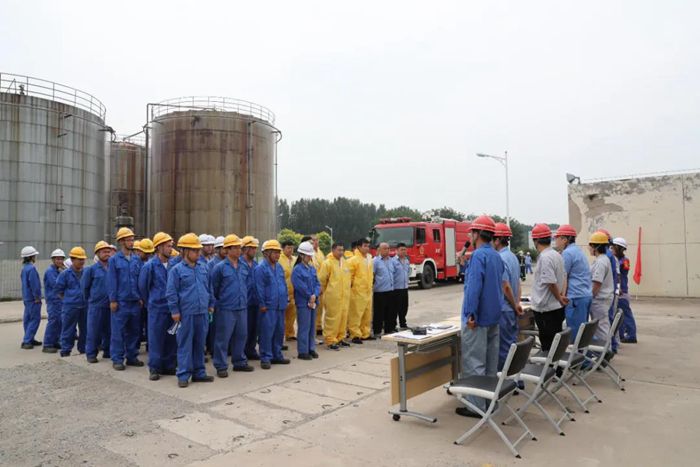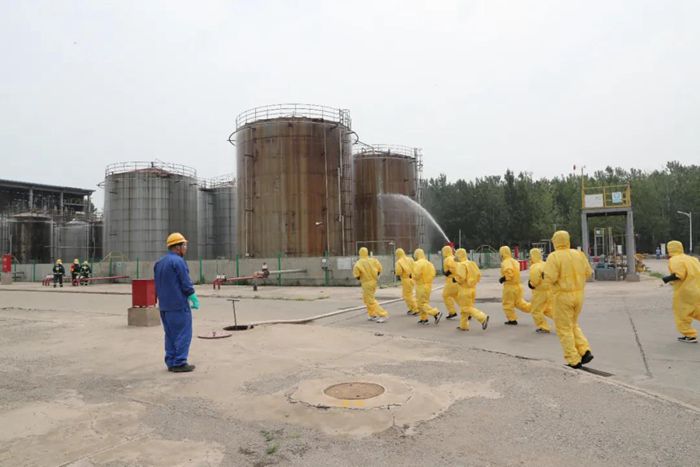 演練假定華騰天海罐區甲醇發生泄漏并引發火災。在演練中,干部職工信息溝通流暢,現場處置有序,分工明確。處置過程中應急救援人員沉著冷靜,現場處置移交順利,及時撲救了“甲醇火災事故”,消除了“火災事故”擴大帶來的更大危險。