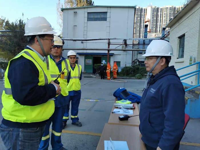 演練人員全部是一線人員。崗位人員發(fā)現(xiàn)氫氣瓶“突發(fā)火情”后,緊急發(fā)出警報(bào),設(shè)置隔離警戒,現(xiàn)場(chǎng)排查,進(jìn)行初級(jí)處置,隨后現(xiàn)場(chǎng)指揮系統(tǒng)啟動(dòng),專業(yè)處置、疏散撤離、與消防等外部支援力量的合作等一系列安全措施有序展開,操作流暢、協(xié)調(diào)到位、環(huán)節(jié)緊湊。