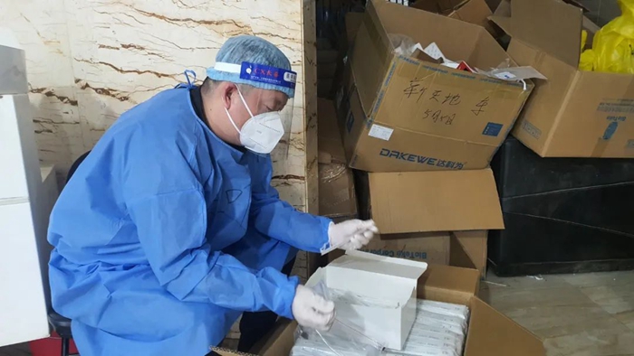 不等社區(qū)同志手把手教,我就掌握了穿脫防護(hù)服、84消毒液配比等工作的方法,又經(jīng)現(xiàn)場(chǎng)緊急培訓(xùn)學(xué)習(xí)了維持秩序、身份信息登記、開(kāi)箱封箱等方法。很快我就上手開(kāi)始了緊張而忙碌的工作。
