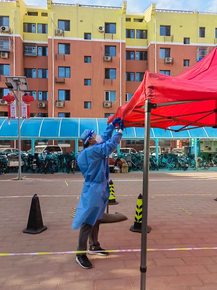 每天早上天剛亮,我就和居委會(huì)的工作人員一起來(lái)到小區(qū)的廣場(chǎng)集合,穿戴好防護(hù)用具,搭建好臨時(shí)遮陽(yáng)棚、拉好警戒線、擺放好檢測(cè)試管和棉簽……為核酸安全采樣做好前期準(zhǔn)備工作。