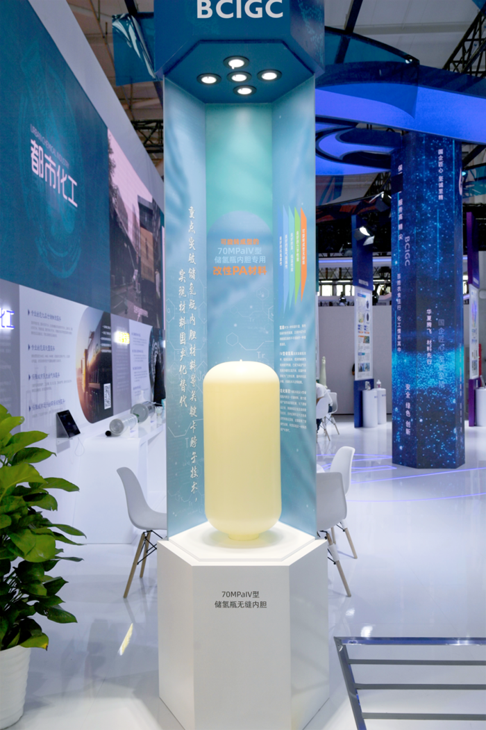 剛剛邁入北京化工集團(tuán)展位所在的4號(hào)展廳,在大門左側(cè),近1米高的儲(chǔ)氫瓶?jī)?nèi)膽吸引了觀展人群的目光,由集團(tuán)所屬華騰京研公司正在研制的,重點(diǎn)突破儲(chǔ)氫瓶?jī)?nèi)膽關(guān)鍵材料等 “卡脖子”技術(shù)的內(nèi)膽實(shí)物,將人們引進(jìn)北京化工集團(tuán)的展位。