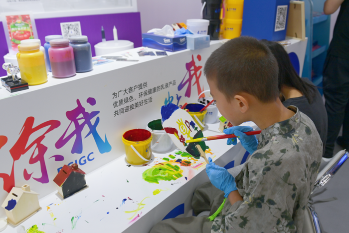 在“涂我、粘我”展區(qū),大朋友、小朋友們紛紛拿起小扇子、小木制房子,用不同的涂料在上面作畫、上顏料;在干箱手套互動(dòng)區(qū),觀展者興致勃勃地套上干箱手套,模擬化學(xué)試驗(yàn)操作,將試劑滴入不同化學(xué)液體中,觀察其中的變化;在防靜電手套互動(dòng)區(qū),觀眾們紛紛體驗(yàn)不戴手套的“麻酥”感和戴上手套后的安全感。3個(gè)互動(dòng)區(qū)使觀展者在動(dòng)手參與中了解產(chǎn)品的特性,對(duì)化學(xué)讓生活更美好有了切身的感受。